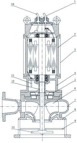 結(jié)構(gòu)特點(diǎn)說明1采用獨(dú)特的雙流道無堵塞葉輪結(jié)構(gòu),提高污水污物的過流能力和排污能力。2自動攪拌裝置,產(chǎn)生極強(qiáng)的攪拌力,將池內(nèi)的沉淀物攪拌成懸浮物后吸入葉輪排出,達(dá)到清淤的作用。3隔板將底座一分為二,攪拌與進(jìn)水互不影響。4機(jī)械密封為雙端面機(jī)械密封,長期處于油室中,保證水泵安全可靠地運(yùn)行。5副葉輪結(jié)構(gòu)的流體動力密封,既有輔助密封作用,從而保護(hù)機(jī)械密封,又平衡軸向力,延長軸承的使用壽命。6泵連線腔內(nèi)沒有漏水檢測探頭,出現(xiàn)漏水時(shí),探頭發(fā)出信號,控制系統(tǒng)對泵實(shí)施保護(hù),本公司可配全自動安全保護(hù)控制柜。7電機(jī)定子采用B級和F級絕緣,內(nèi)設(shè)熱保護(hù)器,當(dāng)電機(jī)過載發(fā)熱,保護(hù)器及時(shí)作出動作,對泵和電機(jī)實(shí)施絕對的保護(hù)。8油室內(nèi)裝有油水探頭,當(dāng)機(jī)械密封損壞后,水進(jìn)入油室,探頭發(fā)出信號由控制系統(tǒng)對水泵實(shí)施保護(hù)。9JPWQ帶內(nèi)循環(huán)冷卻系統(tǒng),能保證水泵在水池最低水位正常工作。